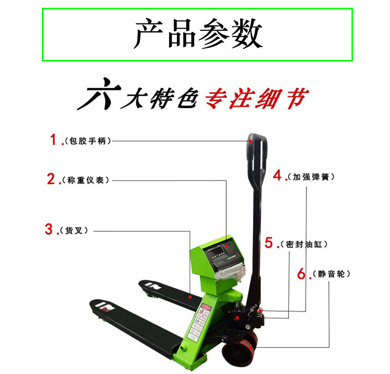 電子秤手動液壓搬運車帶有密封油缸和靜音輪搬運時無噪音。